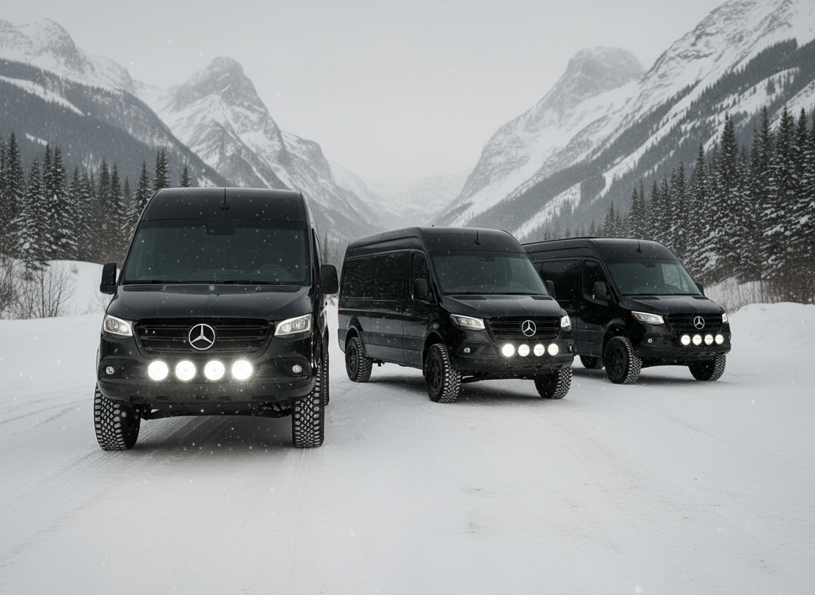 Ultimate Luxury & Safety with our fleet of Mercedes Benz AWD Sprinters equipped with studded snow tires.